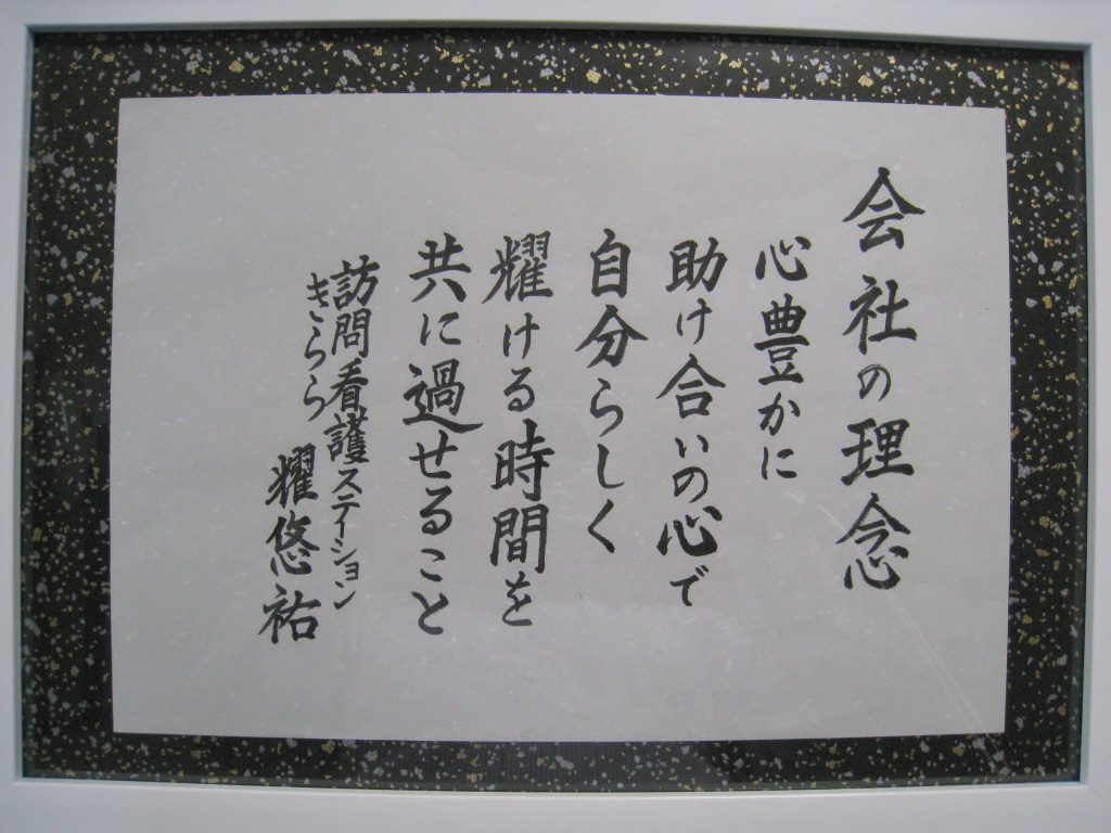書道の先生をされていた利用者の方に書いて頂きました。額も台紙も選んで頂き、額に入れて貰いました。